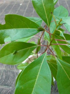 二年前、奈良へ旅行に行って、唐招提寺を歩いていると、上から頭にコツンと落ちて来た。木の実。家へ帰って植えておいたら木が生えてきて葉っぱが出て来た。そしてある日、葉っぱをバリバリと食べている虫の幼虫がいた。