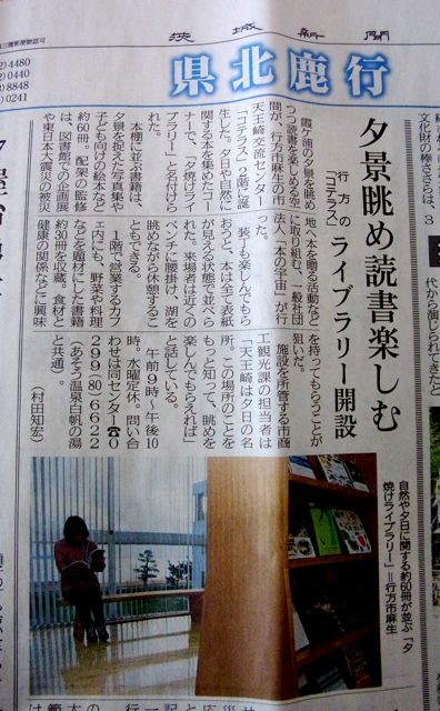 [県北鹿行] 面で茨城県行方市天王崎観光交流センター「コテラス」内の『夕焼けライブラリー』が紹介されました。「図書館での企画展や東日本大震災の被災地へ本を贈る活動などに取り組む、一般社団法人」として「本の宇宙」も紹介されています。